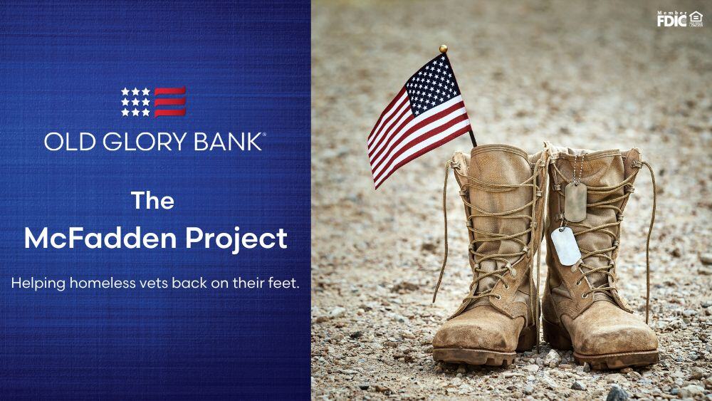 In addition to the McFadden Project, Old Glory Bank supports our service men and women through VA Home Loans, Old Glory Protect, and Charitable Round-Up. Old Glory Protect provides military, law enforcement, firefighters, and US border patrol agents with a $100,000 line-of-duty death benefit free with direct deposit into an Old Glory Bank account. Charitable Round-Up allows Old Glory Bank customers to round up every purchase they make with their Old Glory Bank debit card to the nearest dollar, with 100 percent of that extra change going to partner charities that support in-need and at-risk veterans and their families.